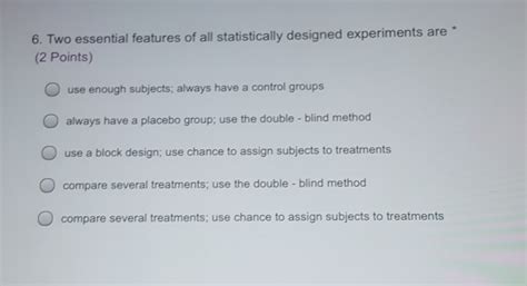 Two essential features of all statistically designed experiments are (2 points) o use enough subjects; Two essential features of all statistically designed experiments are. Use chance to assign subjects to treatments o compare several treatments; (c) always hive a placebo group; Two essential features of all statistically designed experiments are (a) compare several treatments;